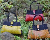 Our custom designed handbags with shoulder strap are each individually handwoven and dyed. Woven of a strong straw/rattan material, then dyed with natural vegetable dyes. Adorned with a front silver ball & feet on the bottom each with pocket, Zipper & magnetic closure,